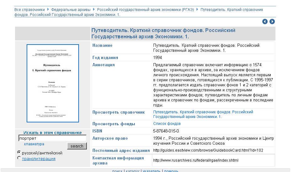 Каждый справочник имеет индивидуальную карточку с описанием всех доступных справочных данных с дополнительными ссылками на контактную информацию архивного учреждения, в котором в настоящее время хранятся описанные в справочнике документы.