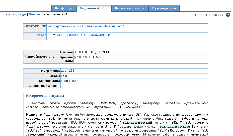 В форме расширенного поиска имеется возможность задания поискового выражения для определенного поля "искать в". Например, если  в списке полей "искать в" выбрать "историческая справка", а в "предмет поиска" задать запрос "технологический", то в результате будут найдены все фонды, характеристика которых в исторической справке содержит слово "технологический". Также будут найдены и все словоформы этого слова.