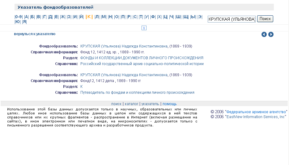 В данной системе предметом поиска являются отдельные фонды,  характеристики которых представлены в справочниках, списки фондов, а также дополнительные текстовые материалы, содержащиеся в справочниках.