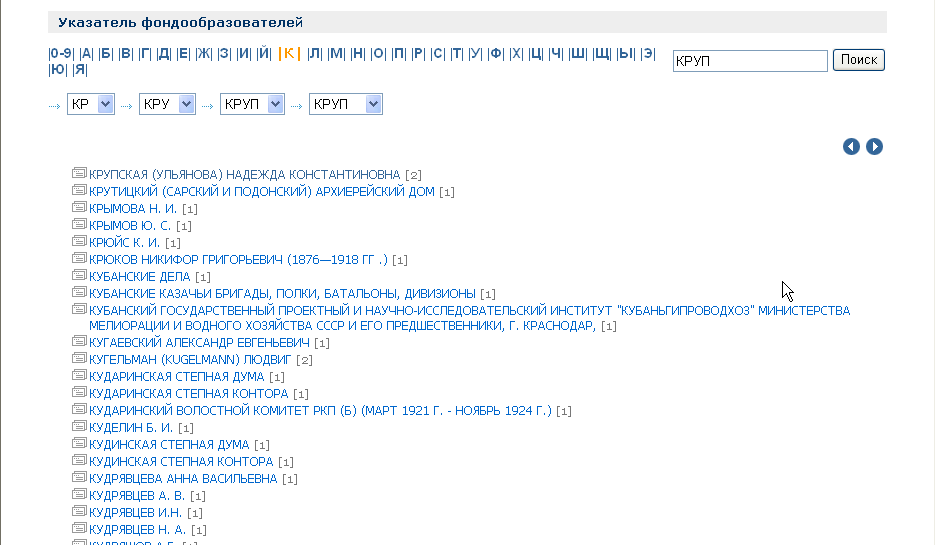 Элементами этого списка являются как отдельные характеристики фондов, так и списки фондов. Общий список разбит на страницы по 20 элементов. Каждый элемент имеет короткую описательную характеристику. Список можно отсортировать по номеру фонда, его названию, начальной и конечной датам документов фондов.