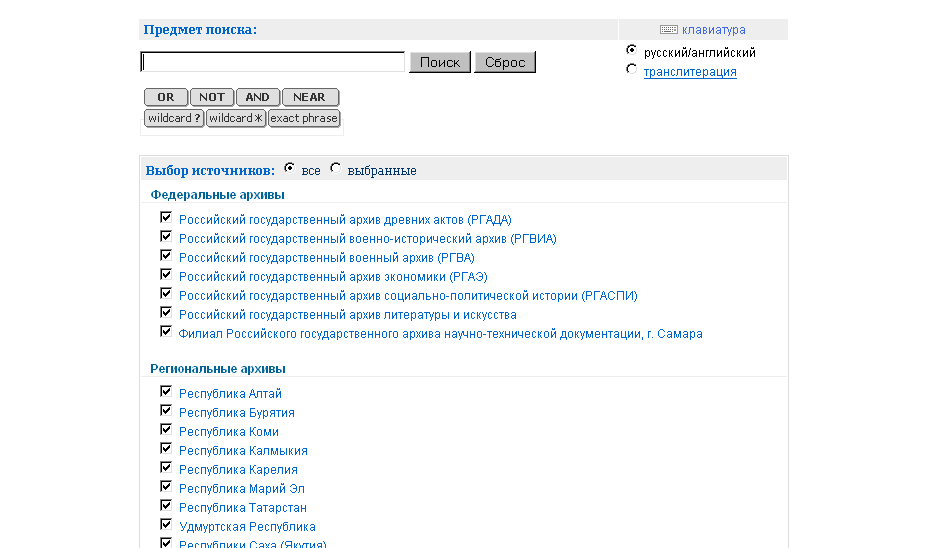 В данной системе предметом поиска являются отдельные фонды,  характеристики которых представлены в справочниках, списки фондов, а также дополнительные текстовые материалы, содержащиеся в справочниках.