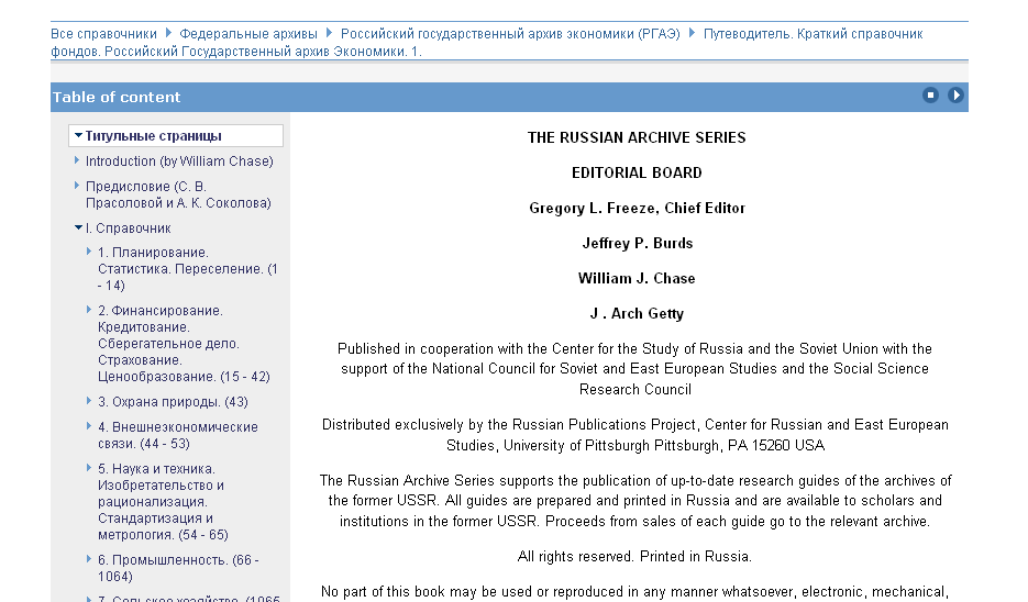В данной системе предметом поиска являются отдельные фонды, характеристики которых представлены в справочниках, списки фондов, а также дополнительные текстовые материалы, содержащиеся в справочниках.